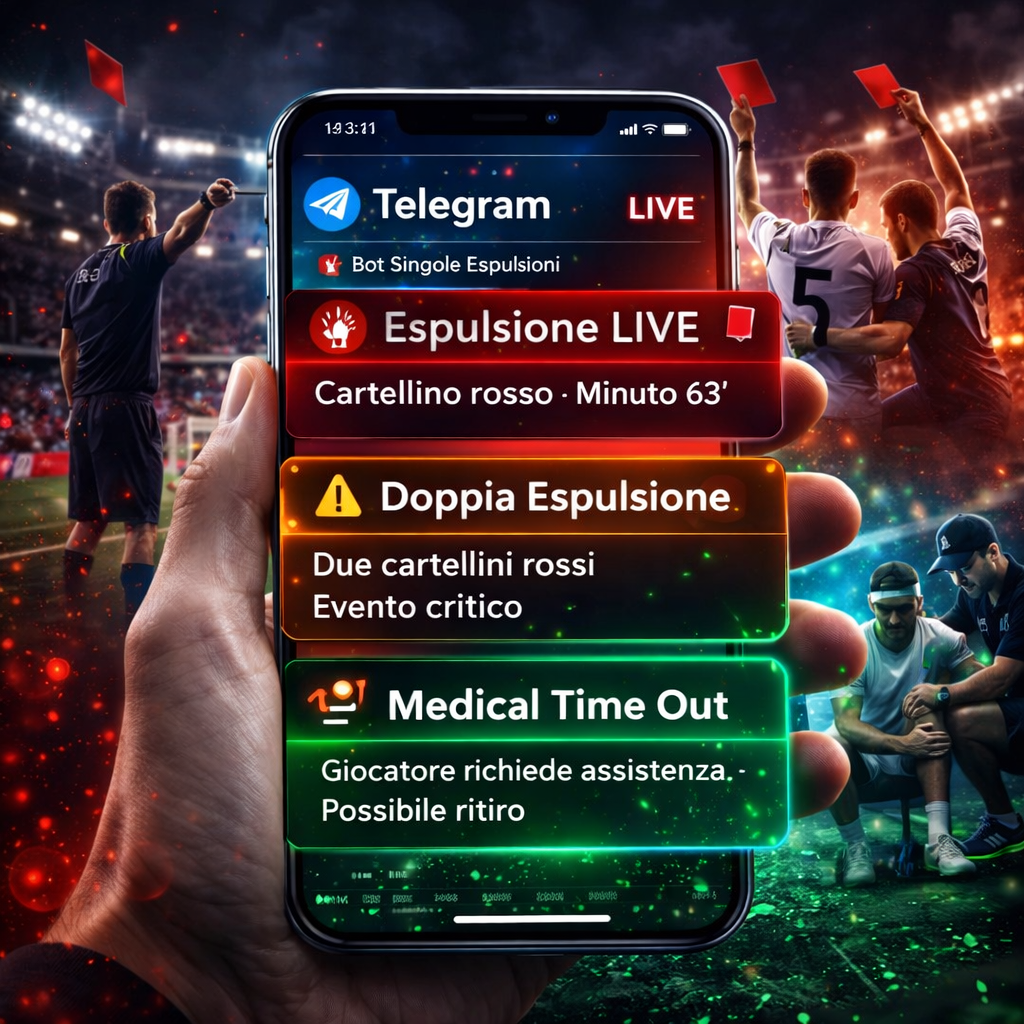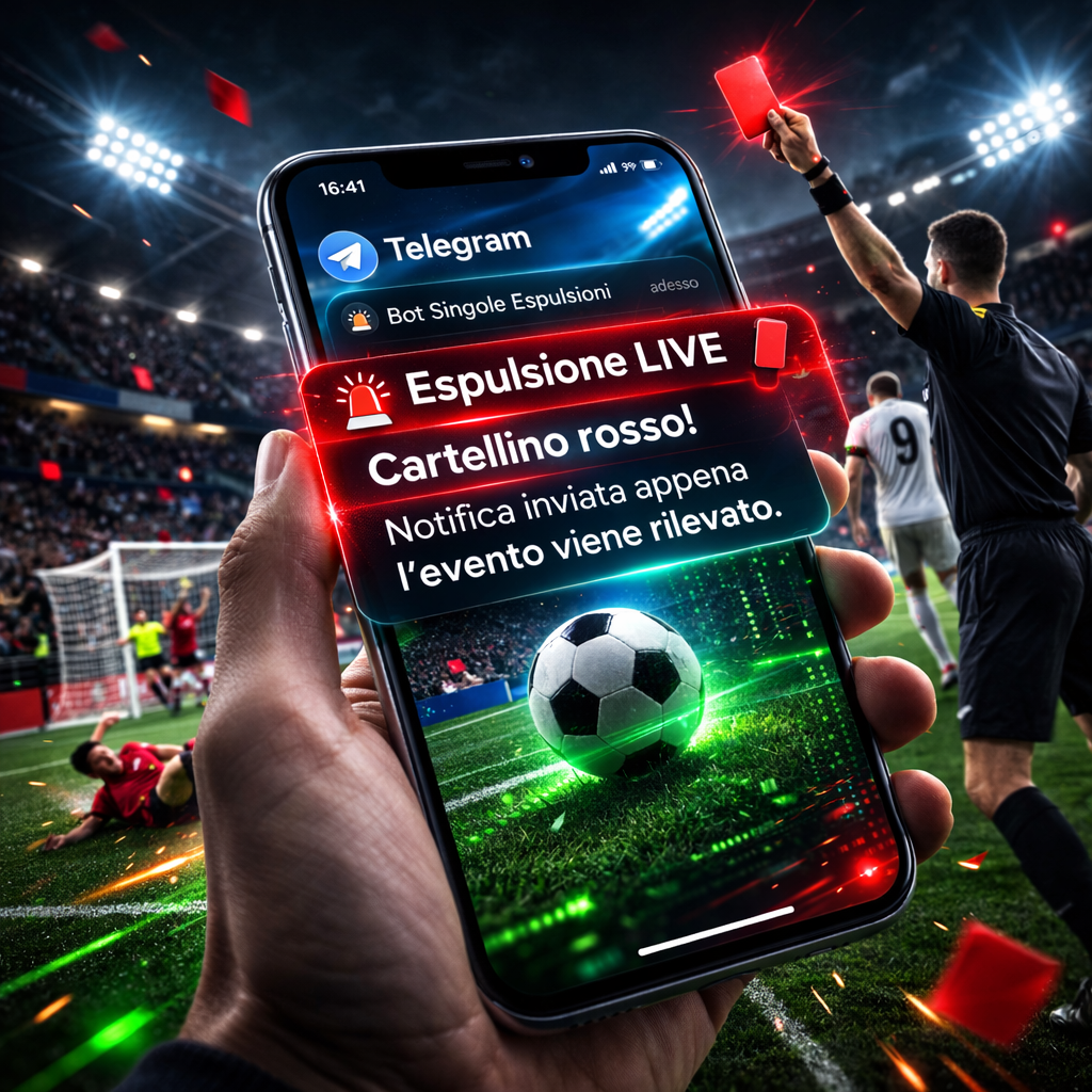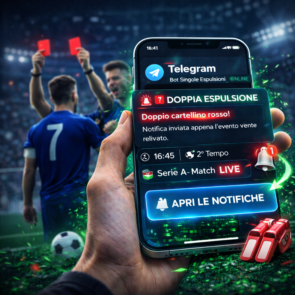 Notifica espulsione LIVE su 20+ competizioni principali. Alert solo se la quota del prossimo goal avversario ≥ 1.40. Win rate 87%. Nessun evento oltre 85'.